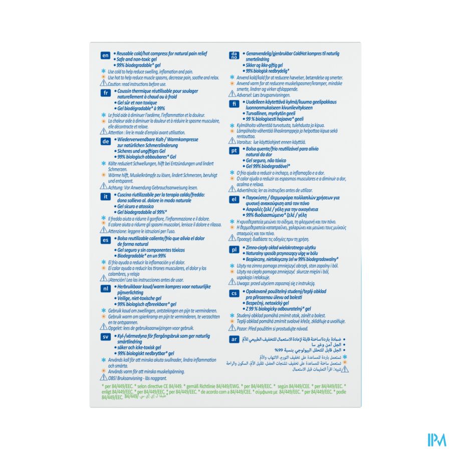 Pijn en ontsteking verzachten zonder medicijnen, dankzij thermotherapie van onze Nexcare ColdHot Therapy Packs. Onze kompressen kunnen worden gebruikt voor warmte of kou en zijn een gebruiksvriendelijke oplossing voor mensen die een behandeling zonder medicijnen willen. De producten kunnen in het vriesvak of de koelkast worden gelegd en kunnen worden verwarmd in warm water of de magnetron. Kneed het kompres om de warmte gelijkmatig te verdelen. Doe het gelkompres altijd in de bijgeleverde hoes of in een schone handdoek bij plaatsing op de huid. Onze gelpack wordt geleverd met een beschermhoes voor snel/gemakkelijk en aangenaam gebruik en om uw huid te beschermen. De hoogwaardige Thinsulate™-laag helpt om de gewenste temperatuur van het kompres langer te behouden. Gelpack, verdeeld in 3 afzonderlijke kussens voor een betere flexibiliteit bij het aanbrengen op lichaamsdelen, met name bij het omwikkelen van arm of been. De verstelbare, elastische band biedt een stabiele en veilige grip.